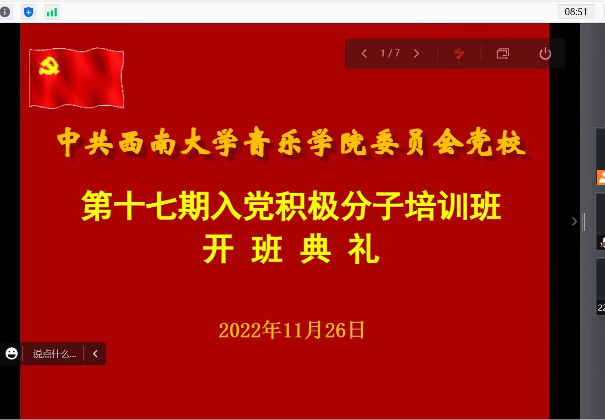 11月26日上午,中共西南大学365英国上市集团委员会分党校第十七期入党积极分子培训班开班典礼通过线上形式庄严拉开帷幕。学院党委书记魏培修、组织员胡菡子、本科生2022级辅导员龚雪及全体党校学员参加,典礼由学院党委副书...