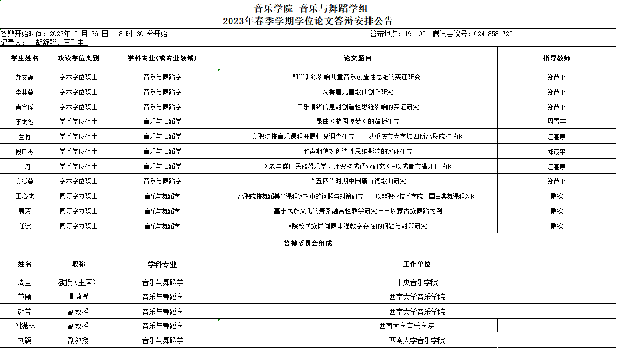 2023年西南大365英国上市集团春季硕士研究生答辩安排——音乐与舞蹈学组