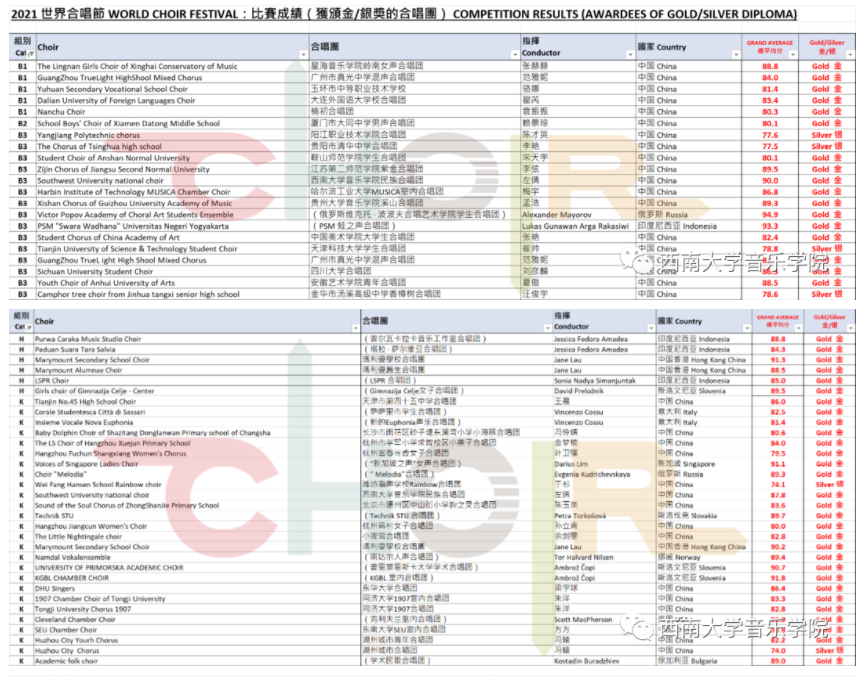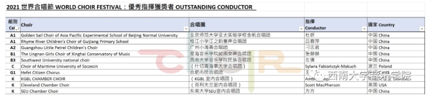 西南大学365英国上市集团民族合唱团在2021世界合唱节比赛中荣获成人组混声合唱、公开组双料金奖!是金奖前三中唯一的大学生合唱团,仅在两个国际专业团之后。并且在此次参赛的中国团队中排名第一!我院优秀青年教师——左倩老师荣获2021世界合唱节“优秀指挥奖”!