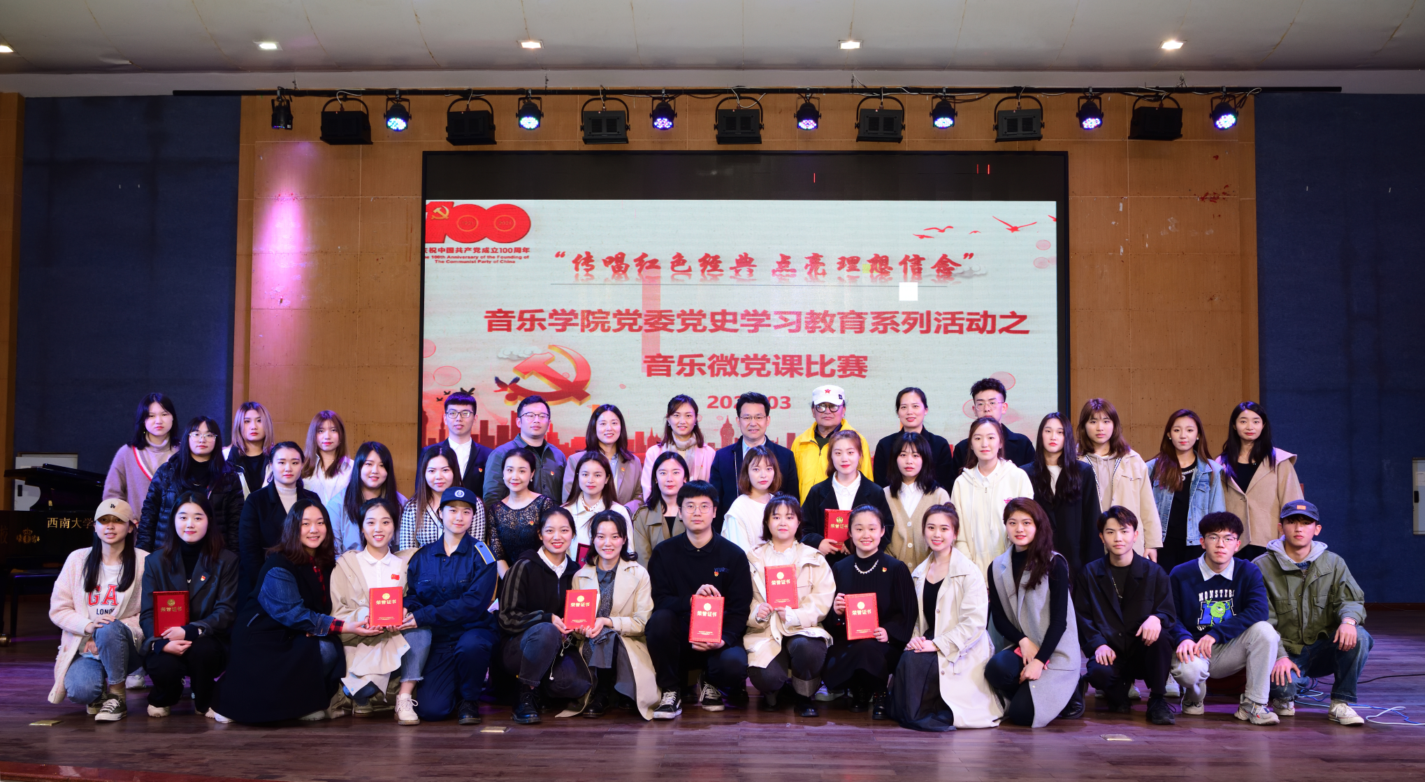 活动于3月26日在学院小演奏厅举行,校团委副书记张瑜老师,重庆艺术工程职业学院服装与表演学院院长刘增宪老师,学院党委书记罗义文老师、副书记陈铮老师、专职组织员胡菡子老师、团委书记杜和军老师出席并担任评委,学院全体学生党员和积极分子现场观摩学习。