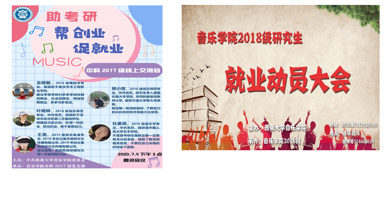 为进一步助力音乐学子成长成才,提升就业能力和水平,拓展就业渠道,在学院的大力支持和精心组织下,研究生2018级和本科生2017级分别开展了主题为“促就业,帮创业、助升学”2021届就业动员大会。