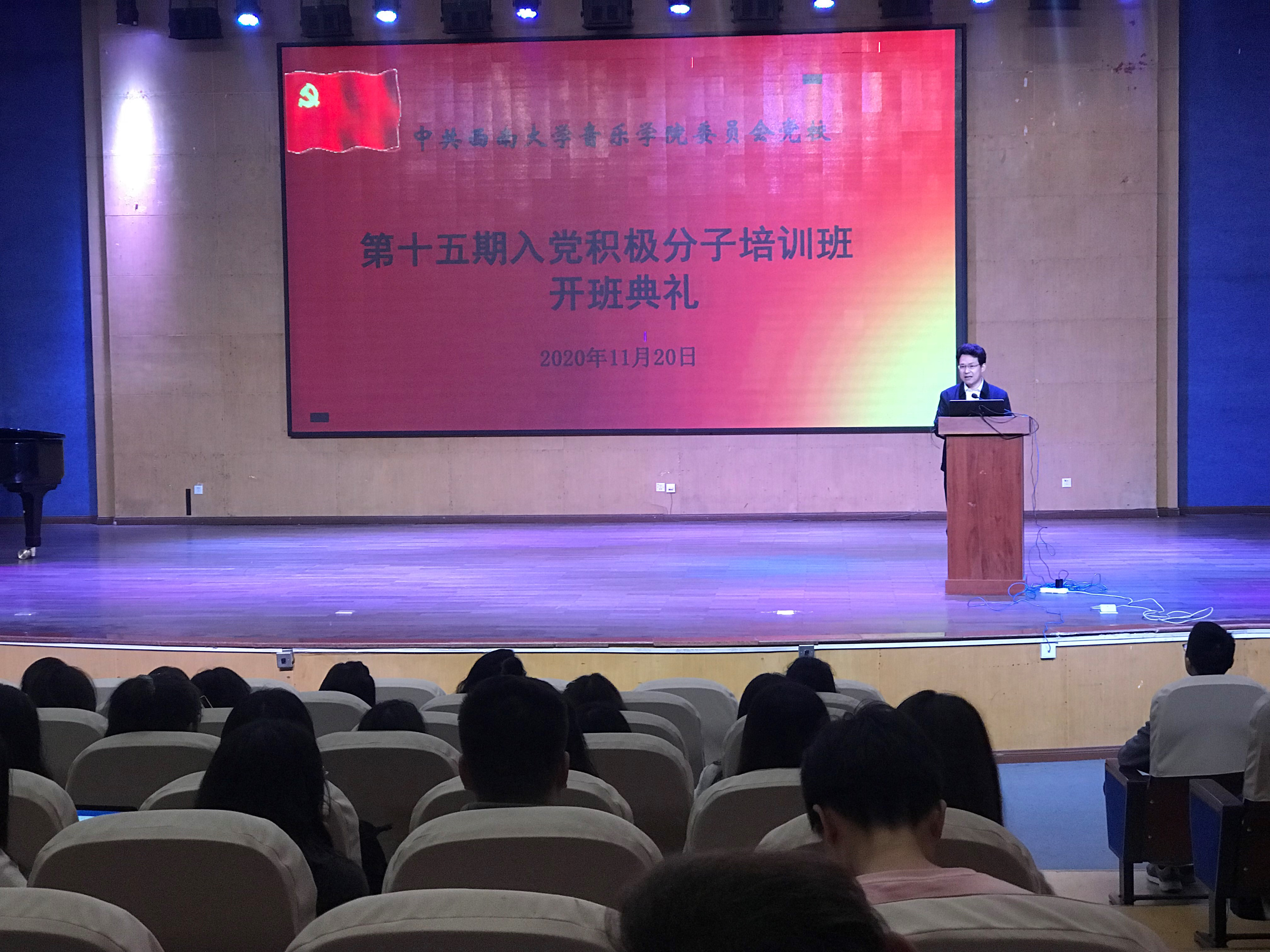 11月20日下午2:30, 中共西南大学365英国上市集团委员会第十五期党校入党积极分子培训班开班典礼在365英国上市集团小演奏厅举行。365英国上市集团党委书记罗义文、副书记陈铮、组织员胡菡子、团委书记杜和军及全体学员参加,典礼由陈铮副书记主持。