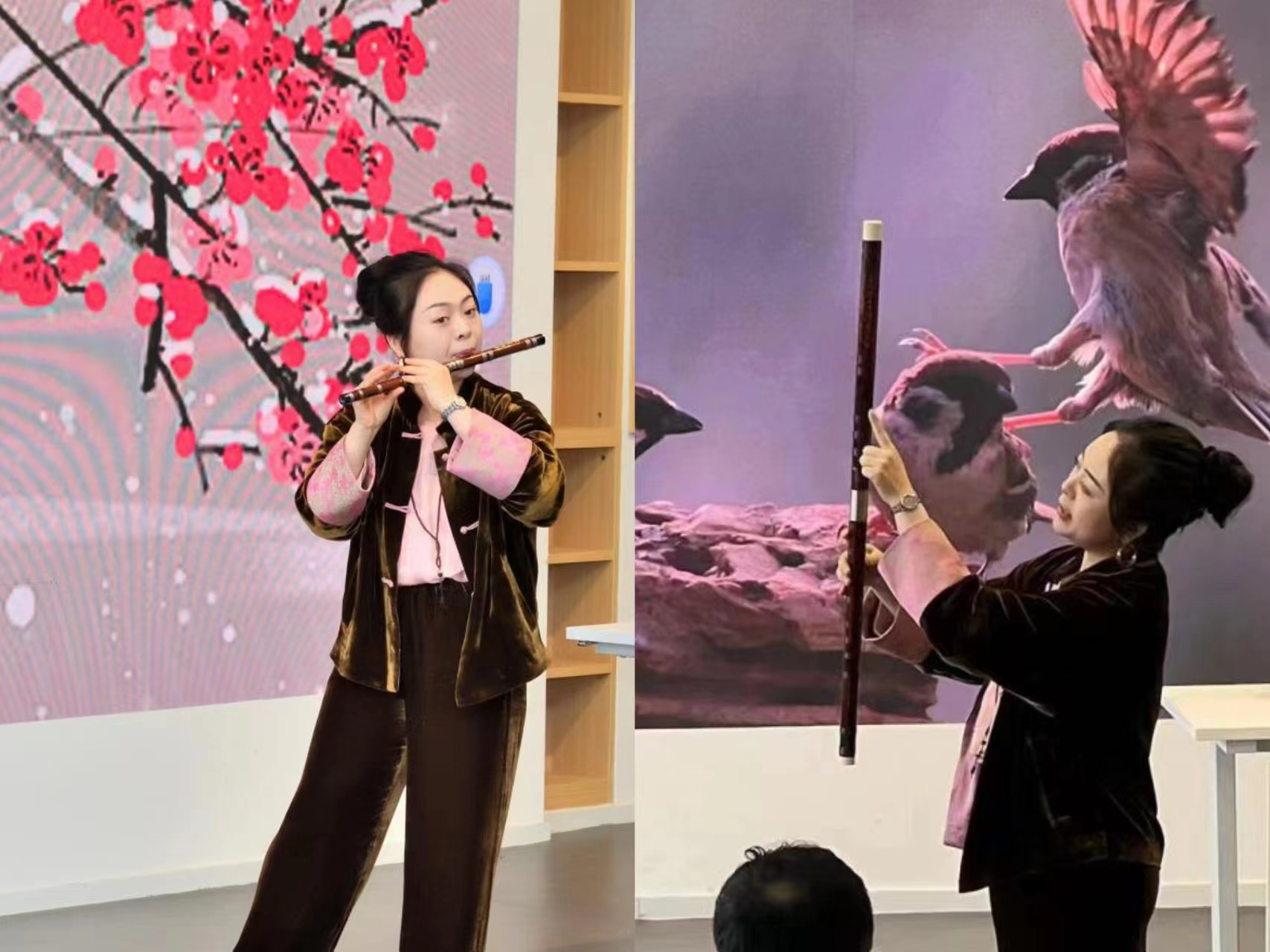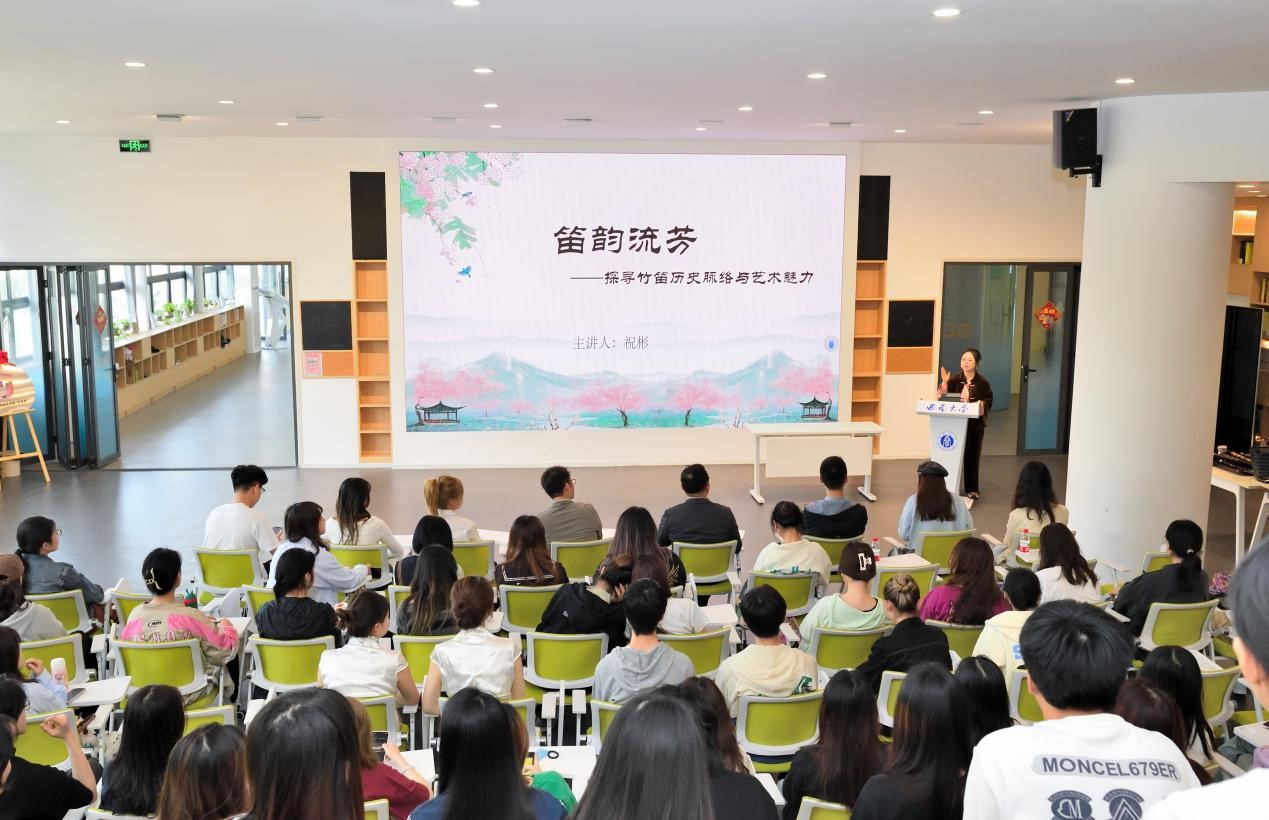 活动第二环节,由学院青年竹笛演奏家、竹笛专业教师祝彬为在场师生带来“笛韵留芳——探寻竹笛与艺术魅力”的精彩分享。此次讲座也是“玉兰花开·国乐绽放”中华优秀传统音乐进园区系列美育活动的第一期。祝老师以古人诗歌中的笛声为引,带大家一起回顾历史,品味经典。现场,一首首竹笛经典作品演绎,时而高亢、时而婉转、时而欢快、时而轻柔,让在场观众听得如痴如醉,仿佛穿越千年,身临其境,与先贤对话,与古人共鸣。祝老师的讲座深入浅出,精彩的表演与诙谐幽默的讲解,使得现场欢笑声与鼓掌声此起彼伏,真是有种“杏花疏影里,吹笛到天明”的畅快感。最后,在现场听众的依依不舍中,本次讲座告一段落。