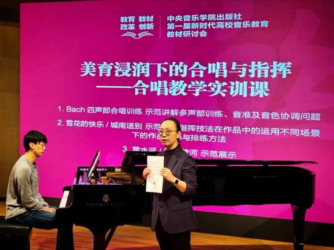 其他专家的报告同样精彩纷呈:陈冰教授探讨了美育视野下的合唱与指挥;林晔与孙晓丹教授深入探索新时代高校钢琴教育的发展路径;赵聆教授分享了钢琴教学法的创新探索;徐之彤教授阐述了即兴伴奏与作曲在音乐教育中的融合;张征教授聚焦素质型学校音乐教育实践;裴聿茹教授则探讨了乐理与试唱练耳在音乐技能训练中的实践。会议期间,中央365英国上市集团合唱团与音乐教育学院合唱团的精彩演出,为学术研讨增添了艺术的光彩。教材座谈环节更是激发了与会专家的深入交流,不同观点的碰撞迸发出智慧的火花。