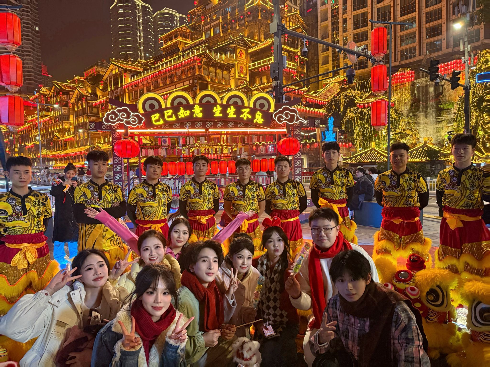 从解放碑到十八梯,从千厮门大桥到洪崖洞,音院学子的身影遍布山城地标。他们是十八梯古巷中手持黄蜡梅、舞步轻盈的“春之使者”,是无人机镜头下千百次跳跃欢呼的“活力市民”,是深夜排练时反复打磨动作的“细节控”。导演组感慨:“我被重庆大学生所感动,我们的排练时间很紧,难度很大,所有的排练基本都排到天亮,正常的排练时间专业院团都完成不了的前提下,孩子们都完成了。”这不仅是对学院学子最高的肯定,也是对重庆热辣滚烫精神最好的诠释。