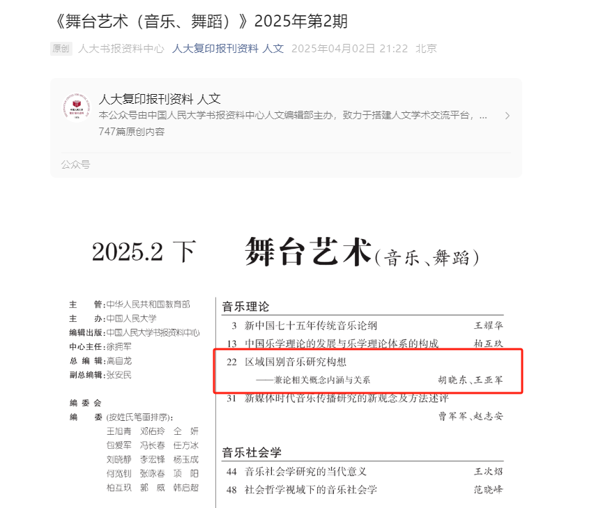 热烈祝贺365英国上市集团院长胡晓东教授《区域国别音乐研究构想》一文被《人大复印报刊资料·舞台艺术》2025年第2期全文转载!该文以跨学科视角,兼采区域国别学和音乐学研究方法,以独到的见解、严谨的论证和深刻的洞察力,廓清了区域国别音乐研究的对象、内容、方法、范畴与目标,对于推动当前音乐学研究的纵深发展具有重要意义。