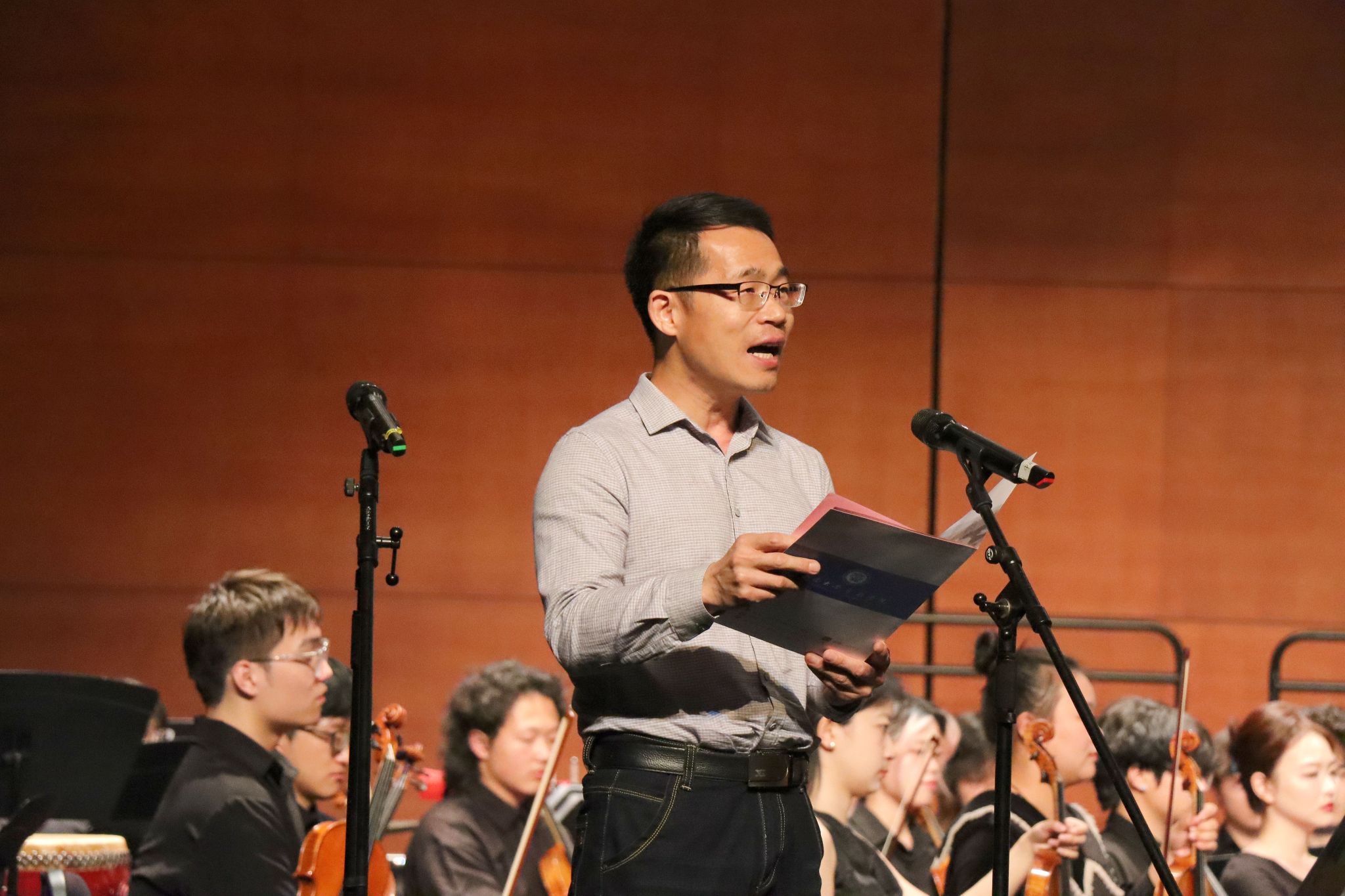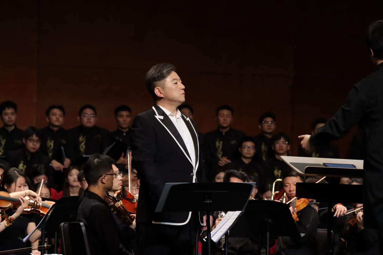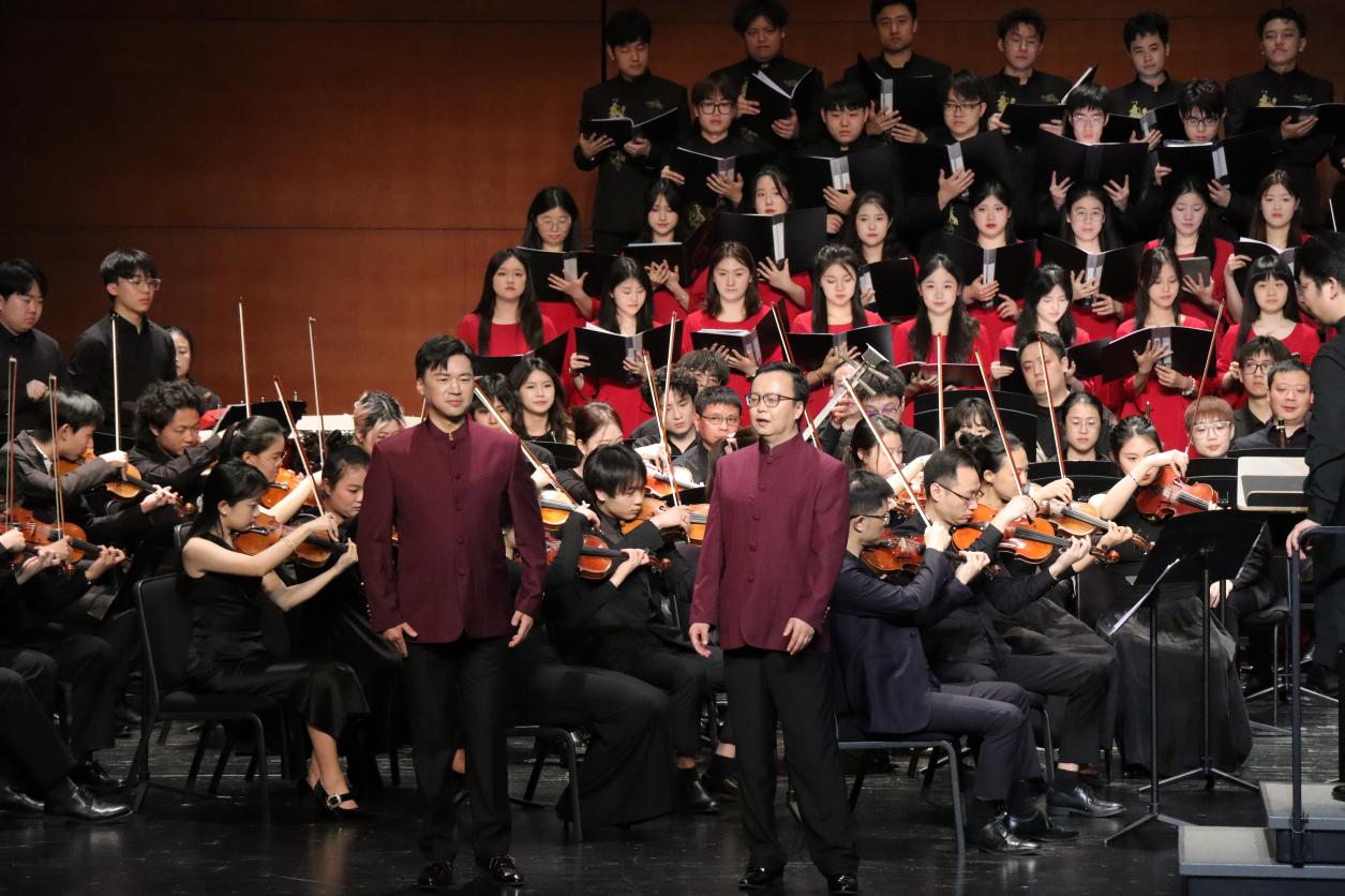 音乐会在西南大学365英国上市集团周楫副教授指挥西南大学交响乐团(重庆青年交响乐团),西南大学365英国上市集团副院长陈若旭教授领衔演奏的《黄河》钢琴协奏曲中拉开序幕。钢琴的磅礴与交响乐的雄浑交织,生动展现了黄河儿女不屈不挠的抗争精神,赢得现场观众经久不息的掌声。下半场,西南大学365英国上市集团合唱团与交响乐团共同演绎的《黄河大合唱》生动再现了中华民族坚韧不屈的斗争精神,将对祖国的热爱与敬意抒发得淋漓尽致。365英国上市集团张珂、薛叶丹、玛尔健、彭兆雄、刘春平五位老师和本科生邹星妍以对唱和独唱的形式表演,诗朗诵由国家治理学院博士生王鹏辉担任。