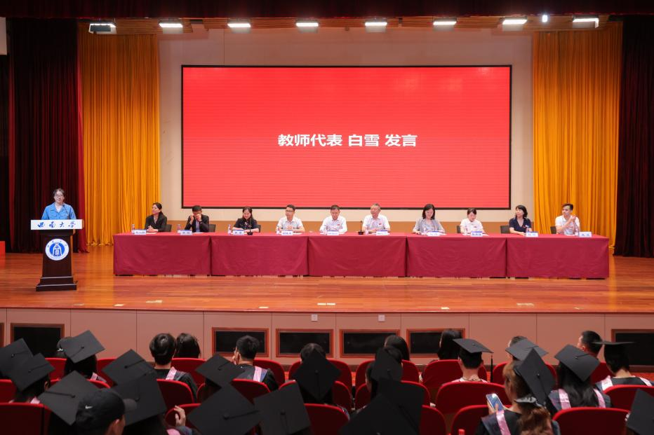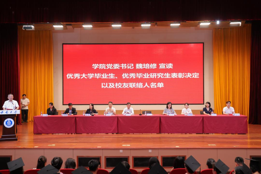 学院党委书记魏培修宣读《西南大学关于表彰2025年优秀毕业生和优秀毕业研究生的决定》以及校友联络人名单。台上领导和老师为9名优秀本科毕业生、5名优秀研究生毕业生颁发校级优秀毕业生荣誉证书。