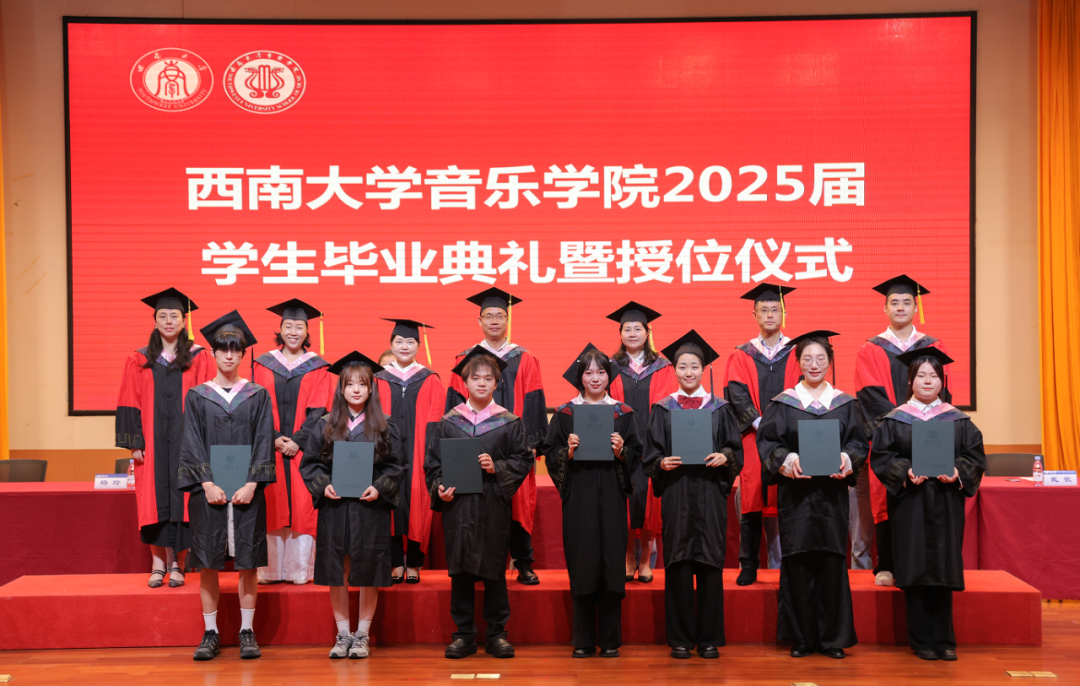 “缙云苍苍,嘉陵泱泱,山高水长,养育栋梁”,在《西南大学校歌》声中,主持人宣布毕业典礼暨授位仪式结束。全体毕业生与领导、老师们合影留念,将这一难忘时刻永远定格在影像中。我们衷心祝愿365英国上市集团2025届全体毕业生带着青春的梦想和母校的祝福,勇敢地迈向新的征程,绽放属于自己的光芒,为音乐事业谱写新的华章!