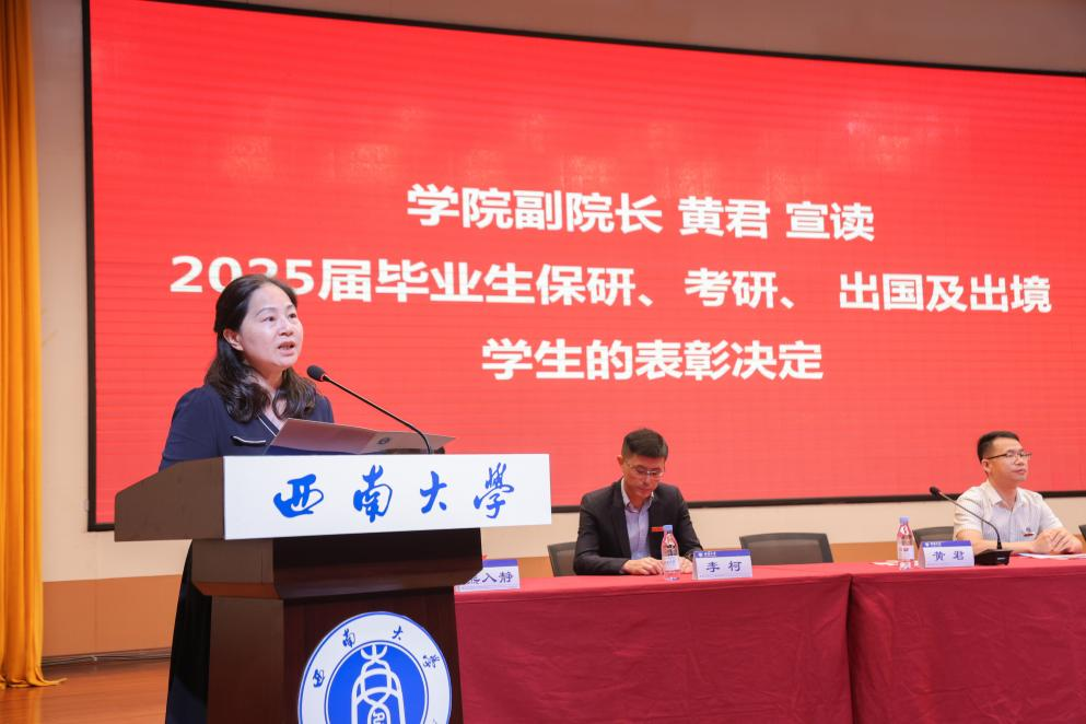 副院长、硕士生导师黄君宣读《西南大学365英国上市集团关于2025届毕业生国(境)内外升学深造的表彰决定》。9名升学深造毕业生代表依次上台领取荣誉证书。