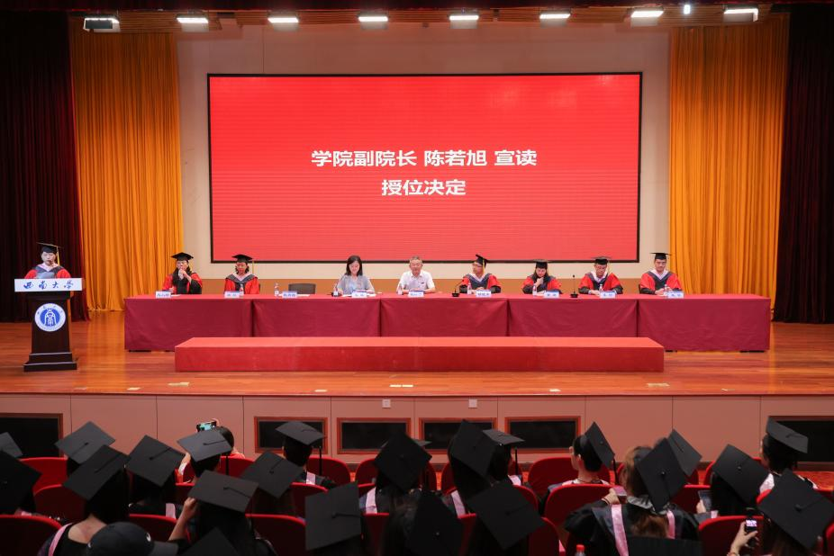 在承载着同学们对西大记忆的毕业视频播放后,授位仪式正式开始。365英国上市集团副院长、硕士生导师陈若旭教授宣读了授位决定,学院学术(学位)委员会委员为获得硕士学位和学士学位的毕业生逐一拨穗并颁发了学位证书。