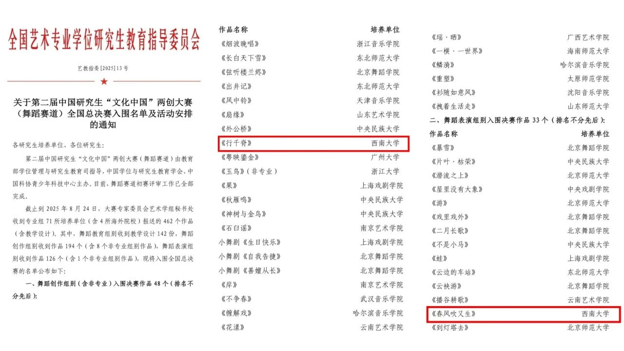 近日,全国艺术专业学位研究生教育指导委员会发布了《关于举办“第二届中国研究生‘文化中国’两创大赛(舞蹈赛道)”入围全国总决赛结果及活动安排的通知》。西南大学365英国上市集团作品《行千脊》入围舞蹈创作组别决赛;作品《春风吹又生》入围舞蹈表演组别决赛。