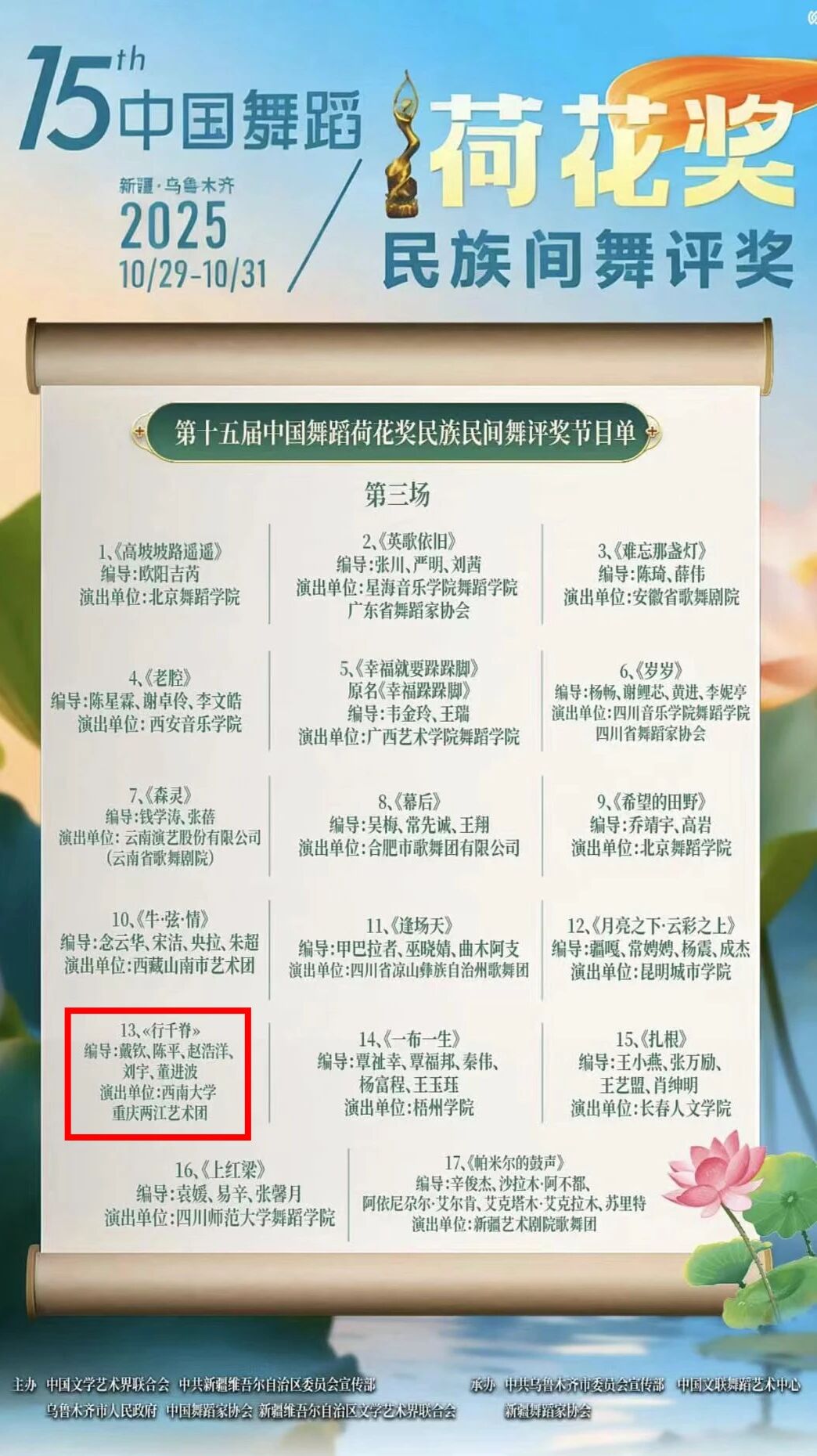 10月29日-31日,由中国文学艺术界联合会、中共新疆维吾尔自治区委员会宣传部、乌鲁木齐市人民政府、中国舞蹈家协会、新疆维吾尔自治区文学艺术界联合会主办,中共乌鲁木齐市委宣传部、中国文联舞蹈艺术中心、新疆舞蹈家协会承办的第十五届中国舞蹈荷花奖民族民间舞评奖终评在乌鲁木齐开幕。