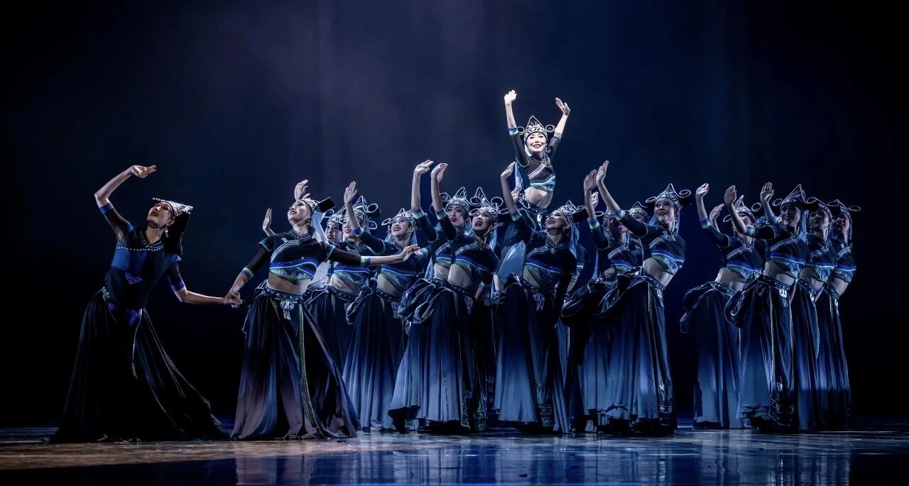 《行千脊》以云南黑傣女性迁徙史为题材,通过服饰、调度与舞姿的多元符号互文,塑造“行千脊,亦成千脊”的民族意象,舞者头戴屋脊形黑帽,背负“家”的象征,在斜线与三角形的调度中,勾勒出山脊的险峻与民族的沉稳.舞蹈高潮处,群舞转身下摆垂落,远望如墨色山水,近观是黑傣画像,实现“小家”与“山河”的视觉叠合。