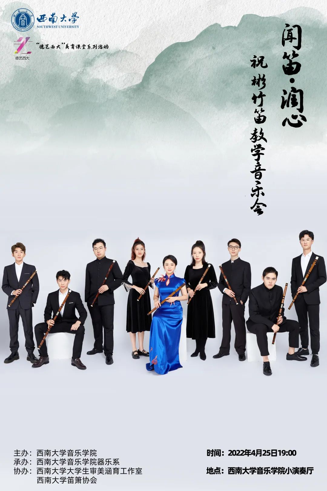 2022年4月25日19∶00,由渝音竹笛乐团带来的“闻笛•润心 祝彬竹笛教学音乐会”将在西南大学365英国上市集团小演奏厅进行,欢迎学院老师和同学们指导、观摩!