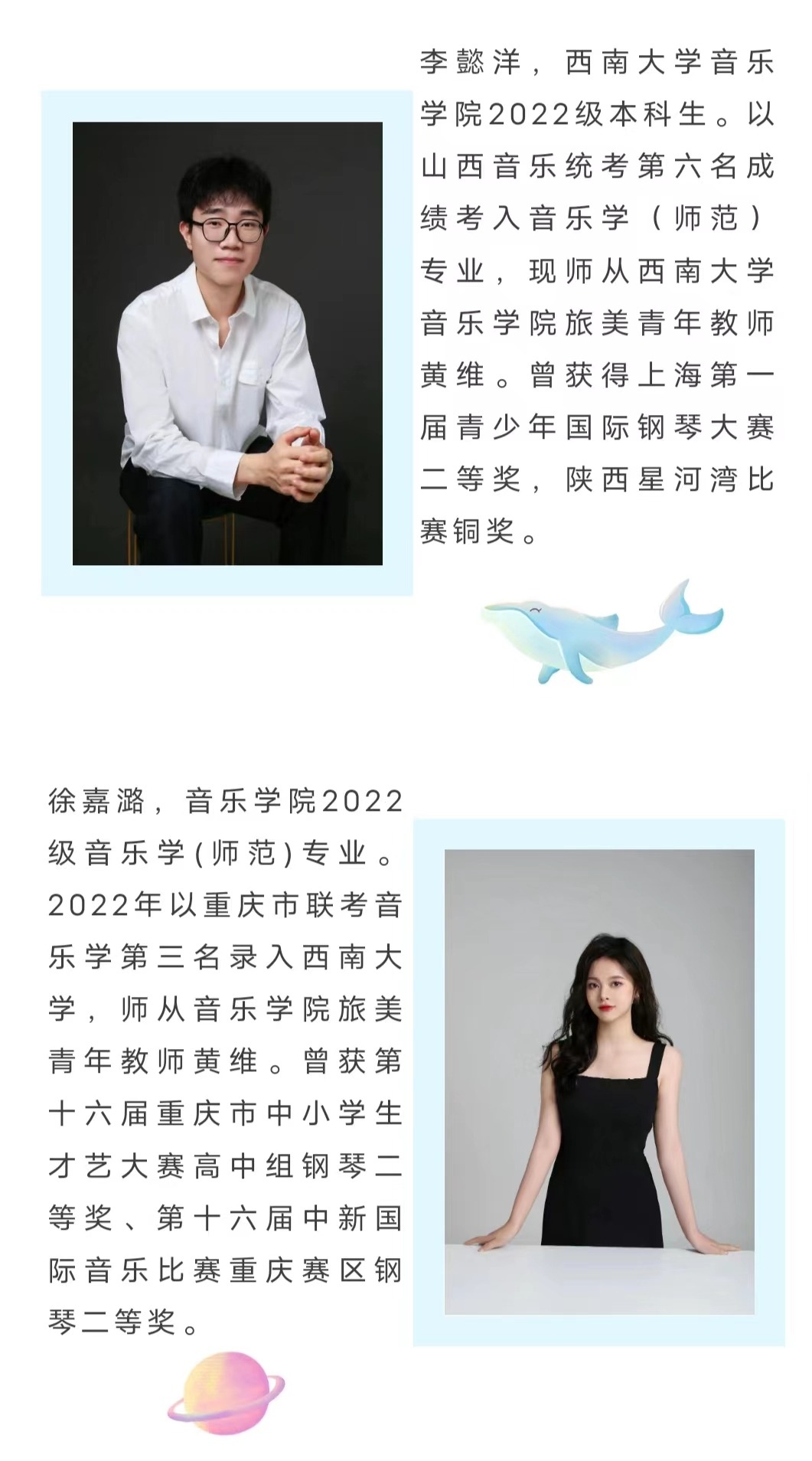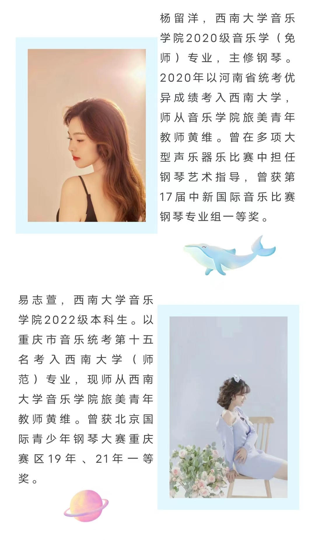 黄维:钢琴演奏博士 (Doctor of Musical Arts),西南大学青年教师,重庆钢琴专业委员会会员。