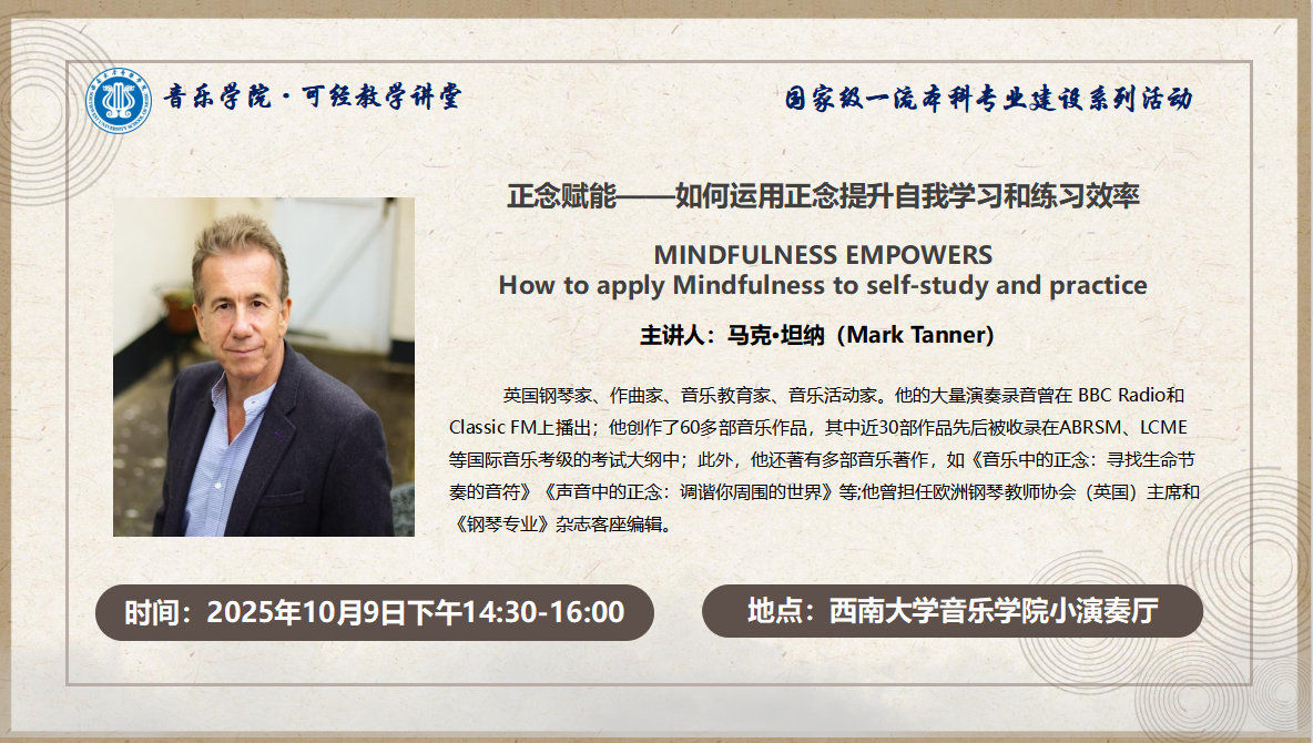 预告|可经教学讲堂:10月9日14:30—16:00马克·坦纳(Mark Tanner)《正念赋能--如何运用正念提升自我学习和练习效率》