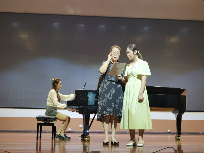 祝爱兰教授在公开课上生动且耐心地对王香懿、王菁婵、程思思、杨璇、何妮(按上课顺序排列)五位同学进行授课,通过对每位同学演唱的细致分析,从歌曲结构、音乐风格和演唱技法等方面进行详细点评与指导。祝爱兰教授指出,同学们在台上演唱时应打开身体,充分地将歌曲的情感表达传递给观众;同时,呼吸声音不要太大,要将呼吸真正地吸进去,才能将声音完全投射出去,从而让坐在观众席最后一排的观众也能听得清楚。