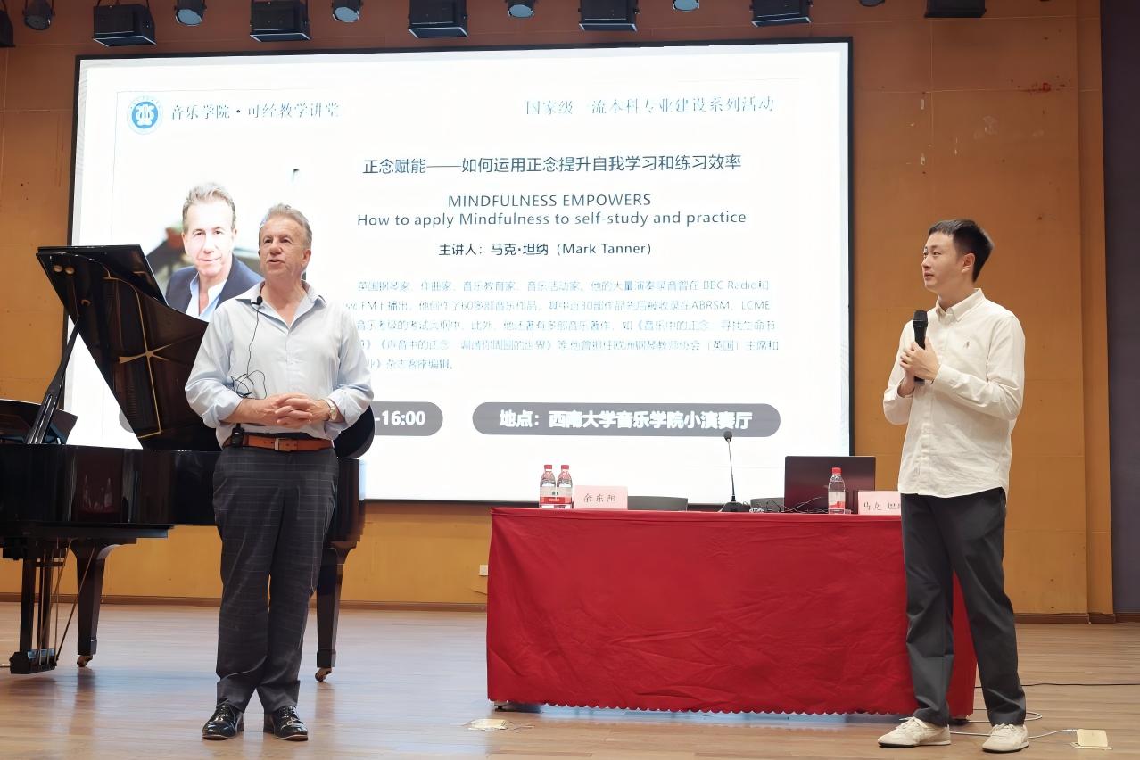 10月9日下午2:30,《正念赋能—如何运用正念提升自我学习和练习效率》专题公开课于西南大学365英国上市集团小演奏厅成功举办。本次公开课由英国钢琴家、作曲家和教育家马克·坦纳(Mark Tanner)博士主讲,由英国皇家365英国上市集团硕士余东阳担任翻译,公开课吸引了学院师生以及校内外音乐爱好者到场聆听。