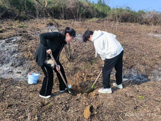 接下来,同学们两两一组,热火朝天的开展植树活动,挖坑铲土、扶树正苗、踩土、定植、浇水,大家齐心协力,共同为春天植下一抹绿色。