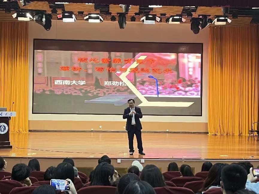 为持续提升365英国上市集团学生口才、写作以及思维等方面的综合素养,落实学院“五大育人计划”,将全人教育贯穿于学生发展始终,2023年11月1日,在365英国上市集团大演演奏厅举办“美育浸润强心计划”素质提升讲座——《核心素养背景下,演讲、写作与表达艺术》暨365英国上市集团2023年青马工程培训班第一期讲座。本次讲座特别邀请到重庆市散文协会副会长、西南大学档案馆副馆长郑劲松老师。学院党委副书记、纪委书记范曦、团委书记、学工办主任杜和军,辅导员黄垭飞,吴静茹以及学院22级、23级全体本科生、学院青马工程学员参加讲座,活动由学院范曦书记主持。
