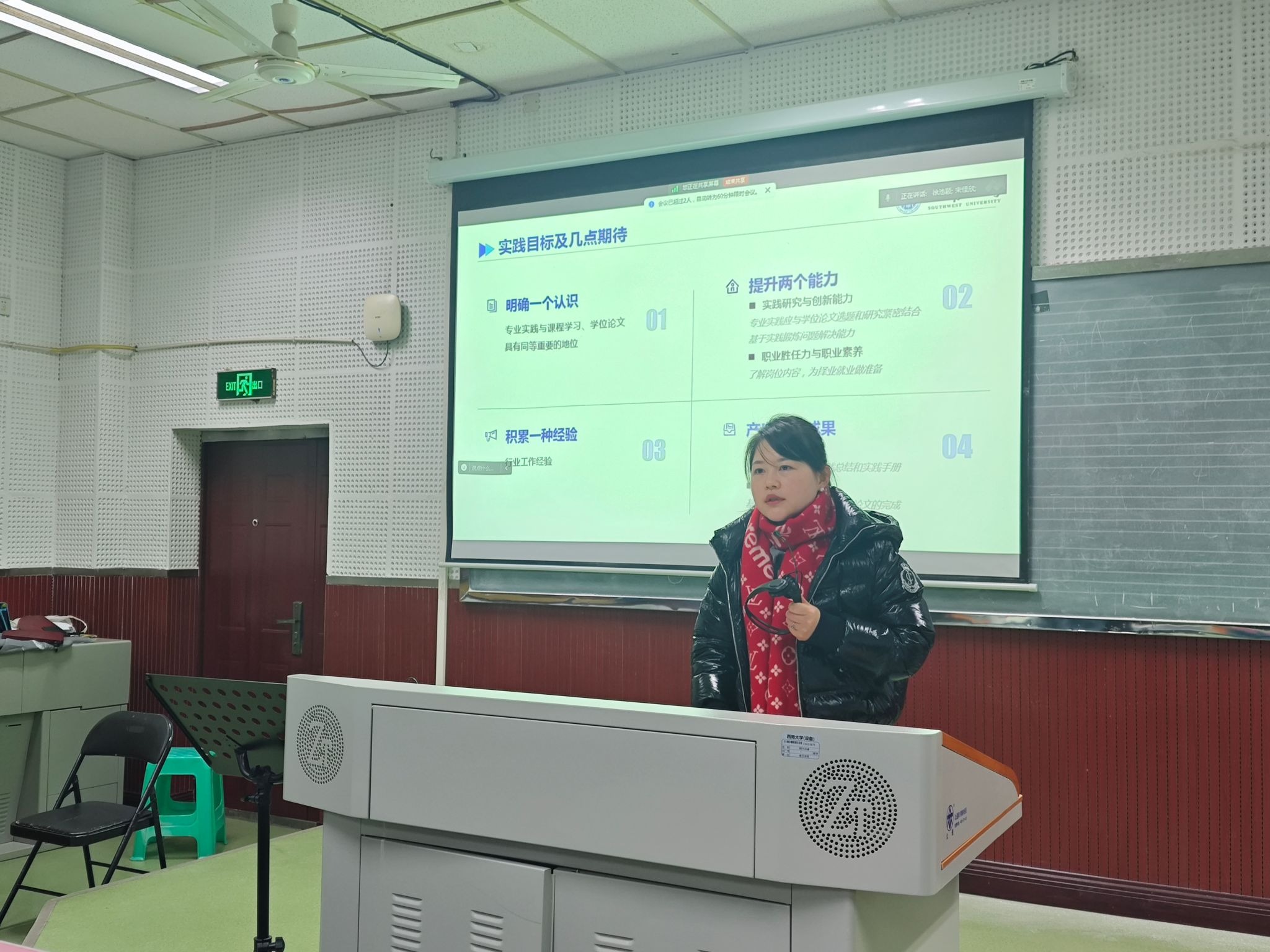 随后,辅导员宋佳欣老师从实践目标、实践安排、实践支持、实践考核等方面对专业实践的具体事宜进行了讲解。她强调专业实践安全第一,希望同学们通过实践能够明确专业实践的重要性、提升实践研究创新能力和职场胜任力、积累行业工作经验、产出实践与理论成果。最后宋老师对同学们关于专业实践的疑问进行了现场解答。