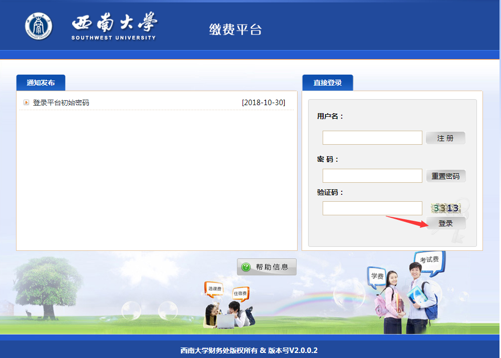 第1步:登录网上缴费平台(http://upay.swu.edu.cn/payment/login.jsp),用户名考生编号10635XXXXXXX、初始密码为Swu123456,输入验证码后,点击“登录”按钮。