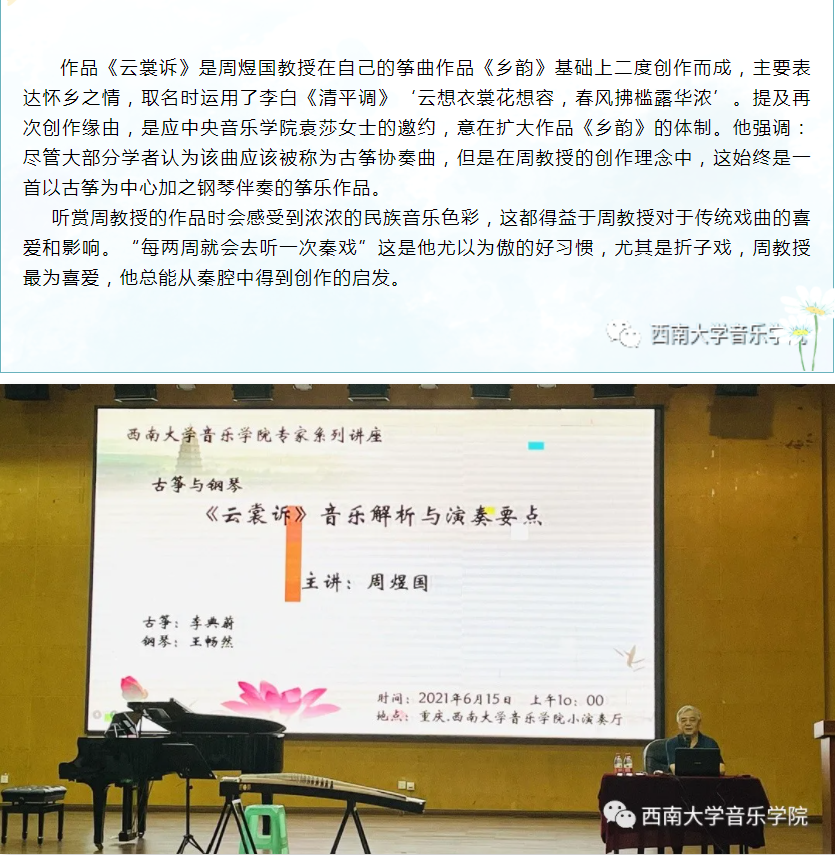 通过这次周教授的讲座,同学们对《云裳诉》这个作品有了更进一步的认识,也充分意识到只有在完全了解作曲家创作背景和创作意图的前提下,才能更好的去诠释作品,为传承和发扬民族音乐贡献出自己的一份力量!