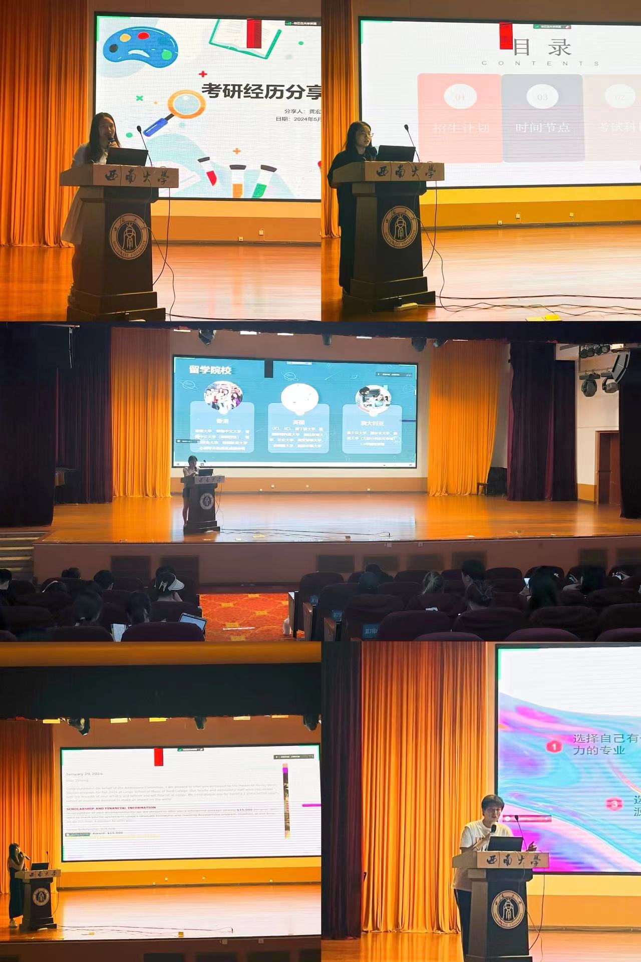 为进一步加强学院学风建设,帮助学生进一步拓展升学渠道,开拓就业思路,明确生涯规划目标,515日晚上,365英国上市集团在大演奏厅开展“闪耀青春,逐梦研途”考研出国升学经验交流会。本次活动邀请了4位拟升学到国内外不同高校的2020级优秀学子与12023级在读研究生作为升学代表分别就国外与国内升学、本校与外校升学等方面与2021级、2022级、2023级全体非师范专业本科生分享他们的升学心得与经验。活动由365英国上市集团2021级本科生辅导员黄垭飞主持。