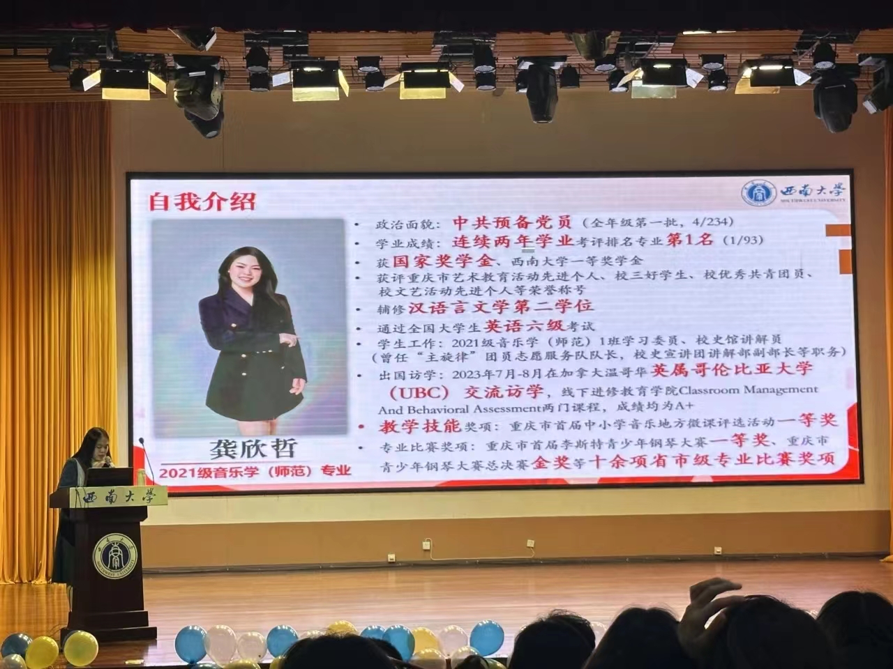 第二位分享人是21级音乐学(师范)田晨研同学分享了实现自我蜕变的重要四点。适应自由,关注规划;适应学习,关注创新;适应实践,关注成长;适应迷茫,关注信息。并且说明了应该适应怎样的自由?为何要关注规划?关注什么样的规则,从而找到正确的大学学习生活打开方式。