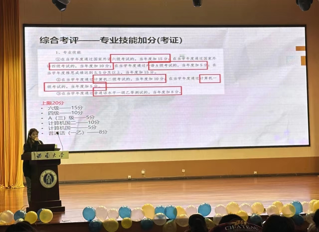 接下来21级舞蹈学郝方靖同学从三,四,六级英语入手,讲到英语的重要性以及英语四六级的题型,不同题型的学习方法、做题技巧,以及考试时的注意事项。