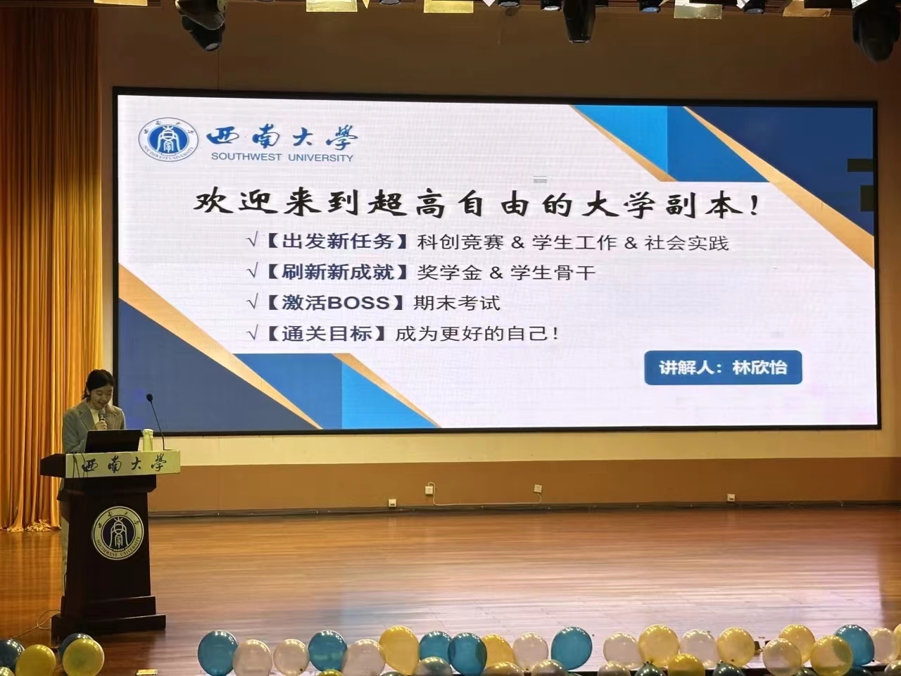 最后21级音乐表演林欣怡同学从【出发新任务】【刷新新成就】【激活BOSS】【通关目标】四个方面分享怎样通过大学副本,以及如何对大学生活做出合理规划,并且她强调要培养简历意识。同时分享备战英语考级的方法以及生活中的礼仪礼貌、沟通话术。