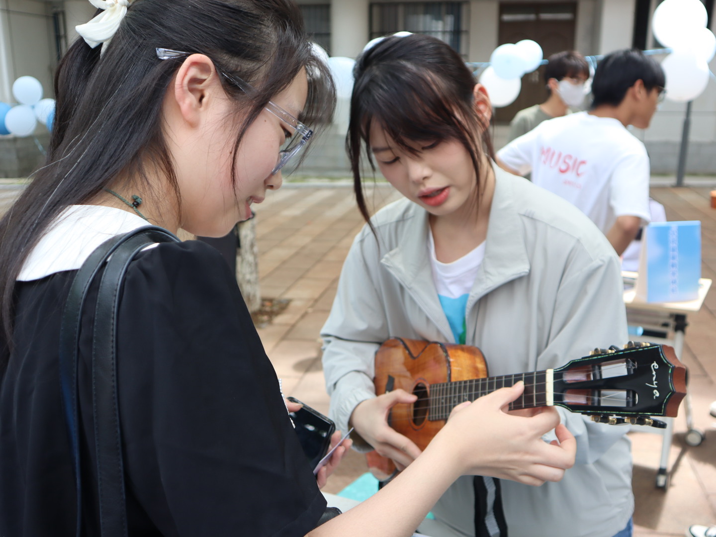 实践启蒙,音乐教学体验启新知:游园活动设置尤克里里“零基础入门体验区”,以“音乐无界,触手可及”为理念,打造沉浸式艺术启蒙空间。包含知识讲解与实践教学,指导参与者学习持琴姿势、拨弦手法、简单和弦等内容,现场学会弹奏《小星星》《童年》等简单小曲子,实现了从“观”到“演”、从“听”到“行”的转变,让参与者在轻松愉快的体验氛围中感受尤克里里的魅力,收获弹奏乐器的成就感。