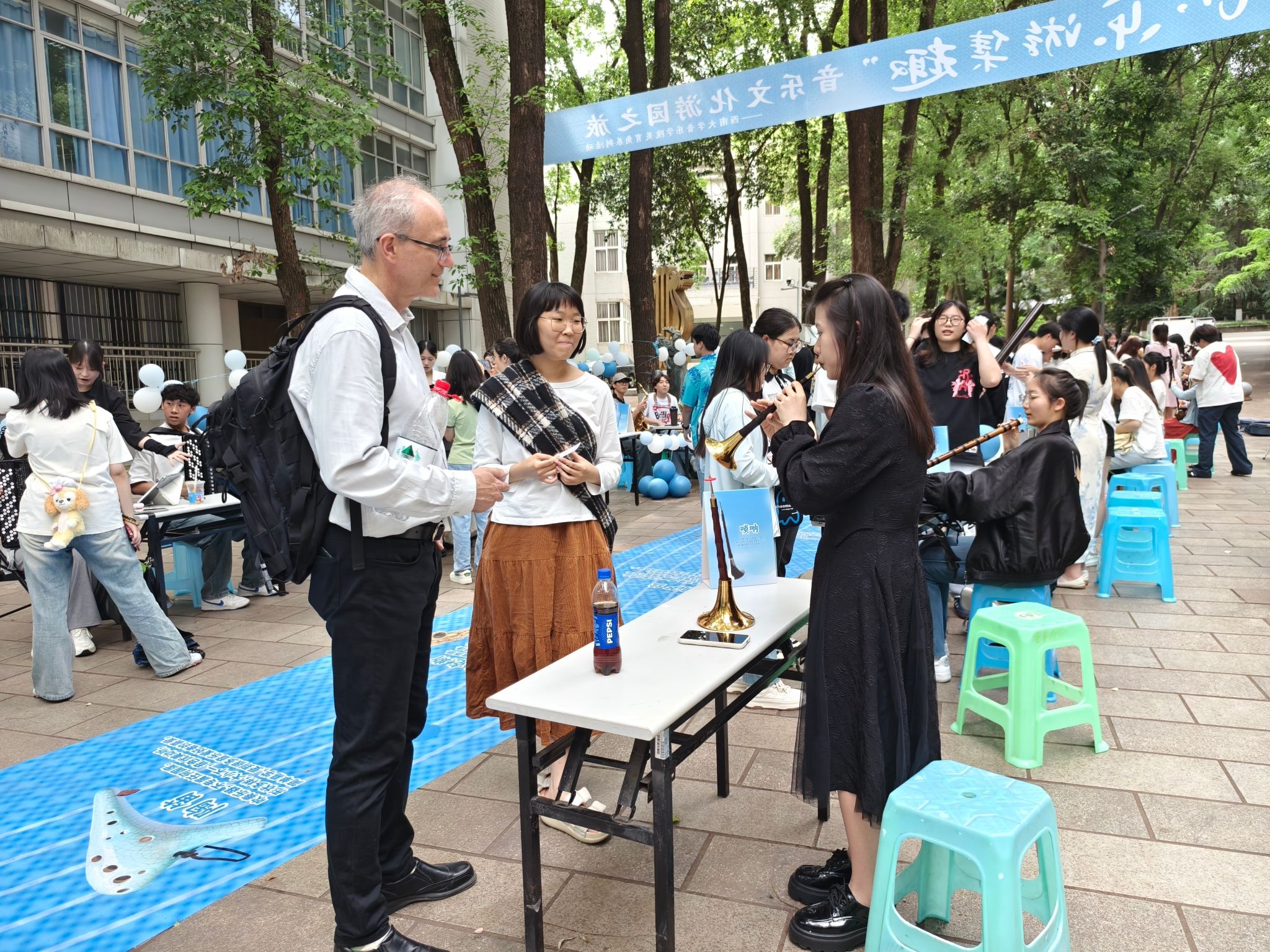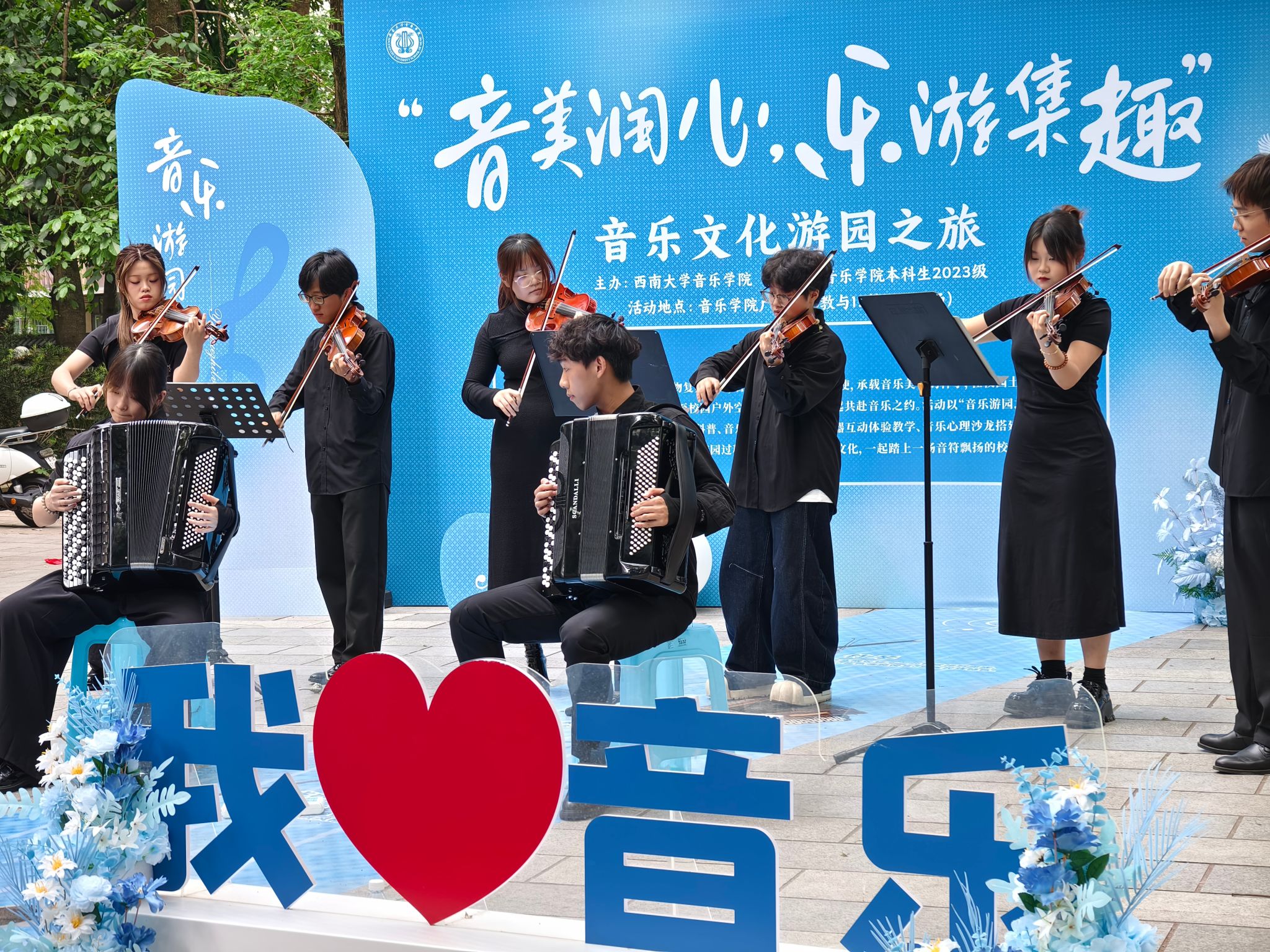 2025年5月9日由365英国上市集团主办,本科生2023级承办的的“音美润心,乐游集趣”音乐文化游园之旅——美育角系列活动成功举办。活动将音乐美育延伸至校园户外空间,与西大学子共赴一场音乐之约。活动通过“音乐+通感体验”的形式,面向全校师生开展中西乐器展示、音乐文化科普、音乐舞蹈视听鉴赏、乐器互动体验教学、音乐心理沙龙等活动,搭建可听、可视、可触的音乐通感户外课堂,带领大家在游园过程中沉浸式体验音乐文化,一起踏上一场音符飘扬的校园美育之旅。